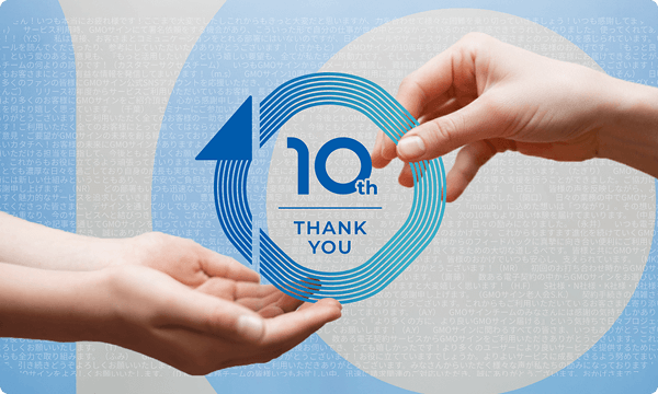 トップページの10周年記念ロゴの背景に敷き詰められた文字は、電子印鑑GMOサインに関わるチームメンバーから寄せられた「感謝の言葉」です。