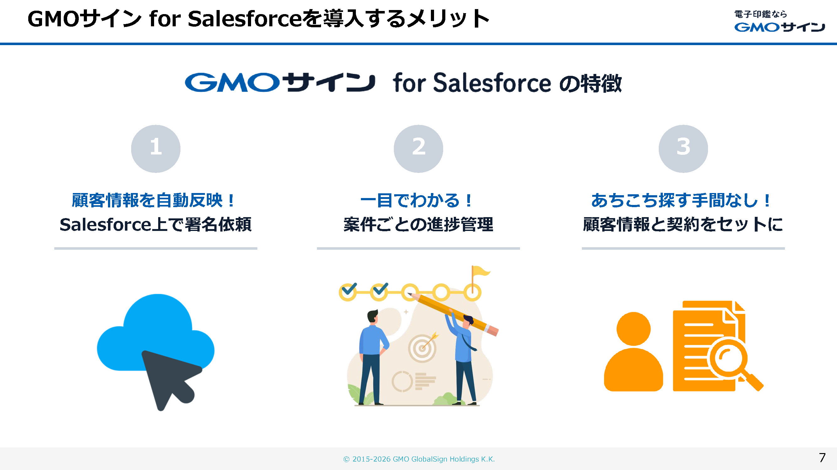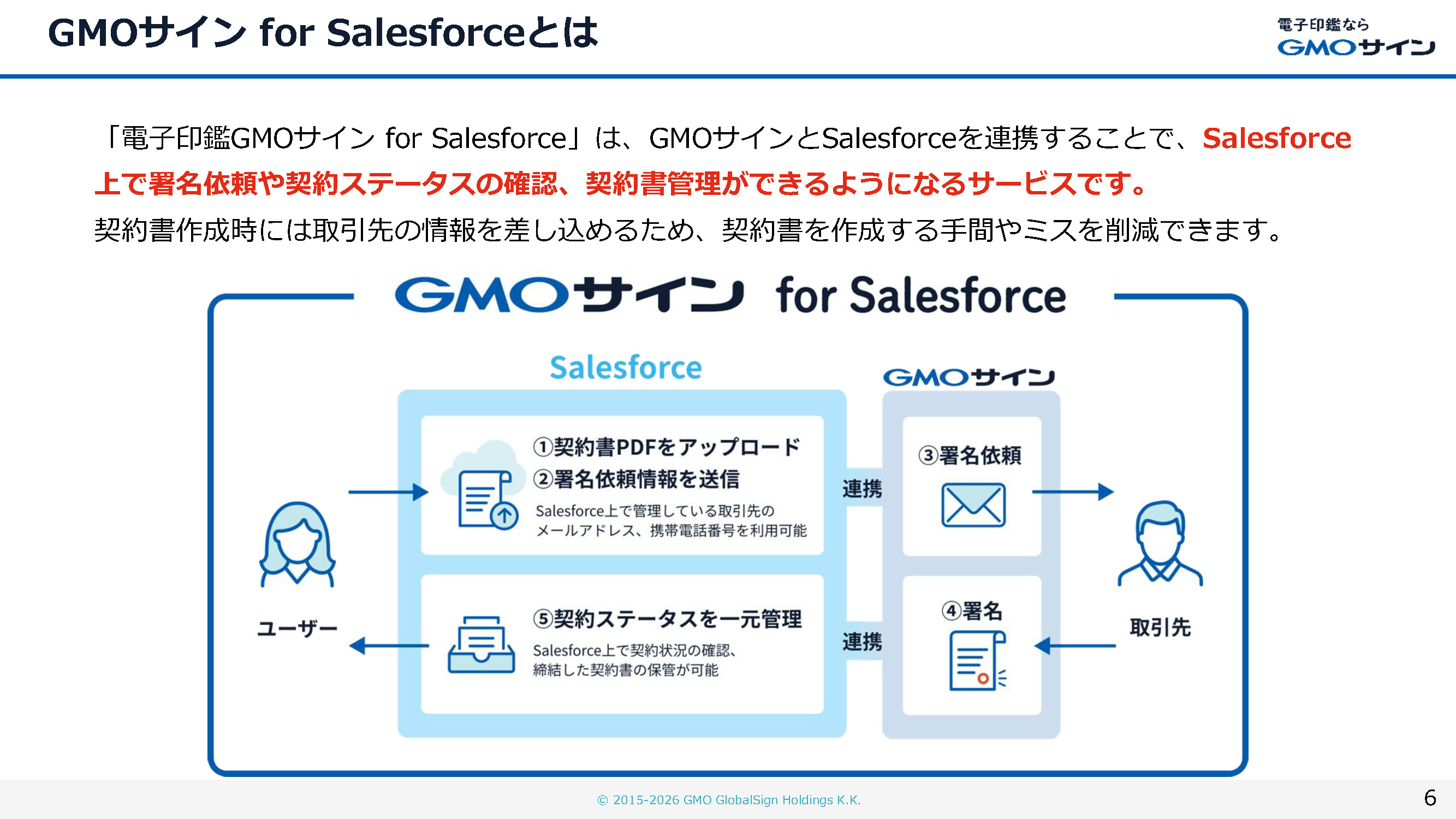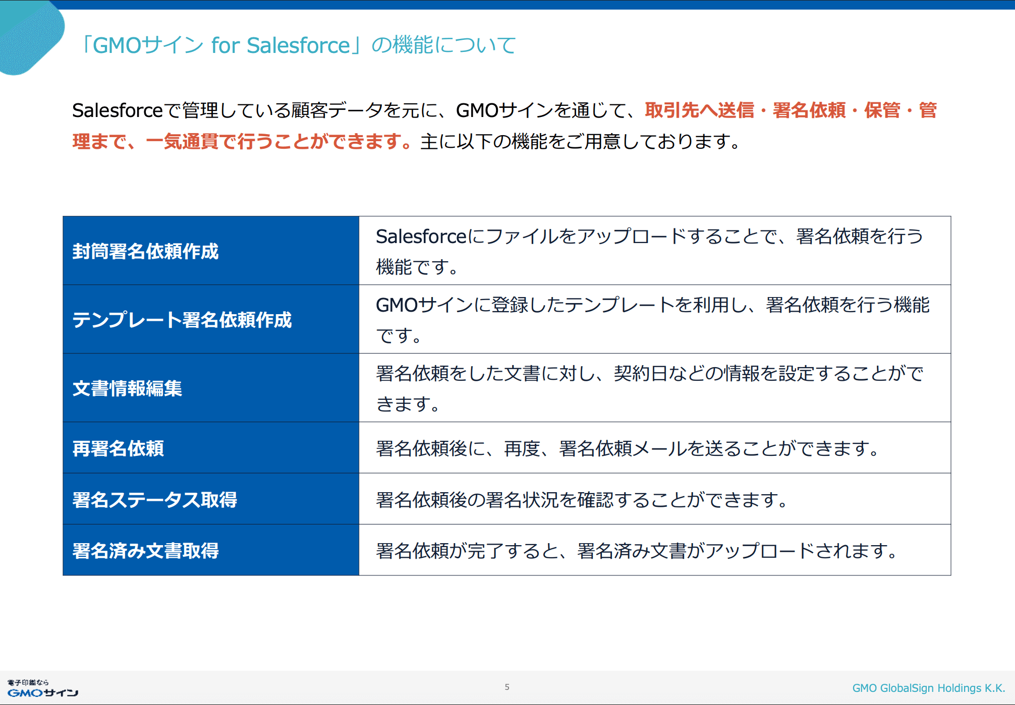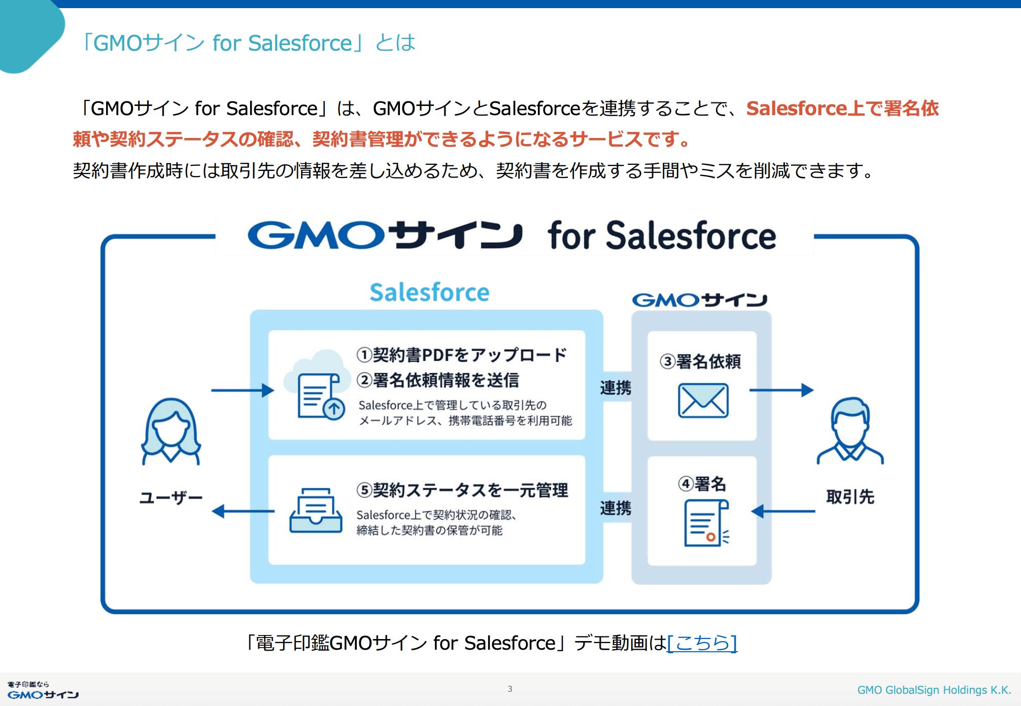 この資料では、「GMOサイン」と世界No.1のCRMプラットフォーム「Salesforce」を連携させる「GMOサイン for Salesforce」の機能とメリットを詳しくご紹介します。Salesforceの使い慣れた画面から電子契約の作成、署名依頼、進捗管理までを一気通貫で行うことで、契約業務の効率化、営業プロセスの加速、そして顧客体験の向上を実現します