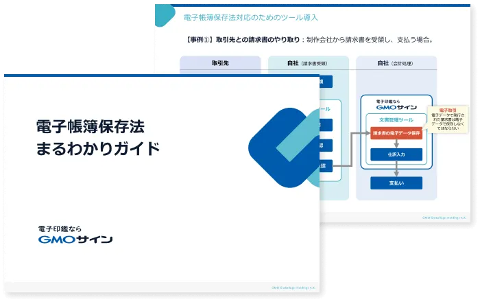 「電⼦帳簿保存法」の概要をはじめ、準備するべき内容や、対応にあたって必要なツールの導⼊イメージまで解説しています。