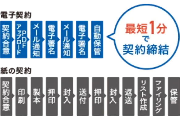 紙の契約書のように、印刷や製本、押印、郵送して相手方の押印や返送などを待つ必要がなく、契約はデジタル上で完結するため作業効率が大幅にアップします。