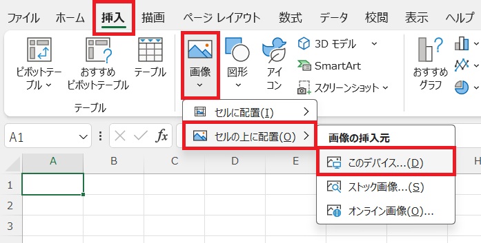 Excelのメニューから「挿入」→「画像」を選び、保存済みの印影PNGを読み込みましょう。
