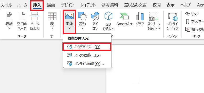 Wordを開き、上部メニューの「挿入」→「画像」をクリックしましょう。