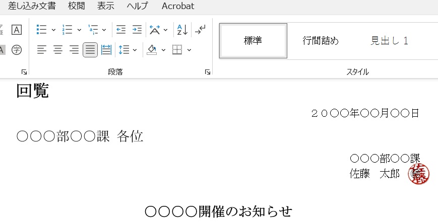 文章の上に重ねたい場合は前面、背景として配置したい場合は背面が適しています。署名欄の右端に印影を配置し、文字や線にわずかに重ねると、実際に押印したような仕上がりになります。