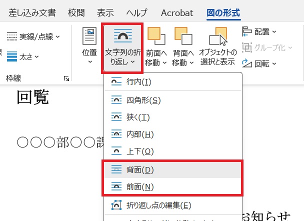 画像を選択した状態で「文字列の折り返し」オプションを開いて「前面」または「背面」を選びます。