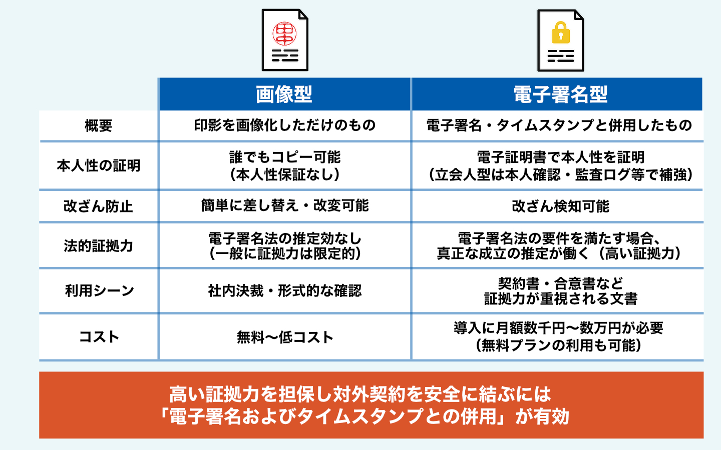 電子印鑑は大きく分けて以下の2種類に分かれ、それぞれ法的証拠力に差があります。