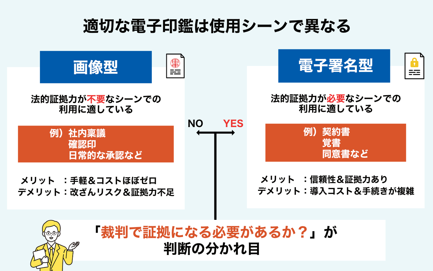 電子印鑑には法的証拠力の強さが異なる2種類のものがあることをお伝えしました。目的別に適切な電子印鑑は以下の表をご覧ください。