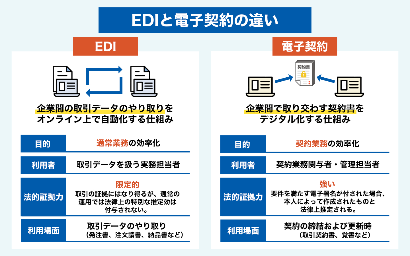 EDIは、日々の取引業務における改善がゴールであり、電子契約は契約手続きにおける改善と法的証拠の確保がゴールであるように、解決する課題領域が異なります。