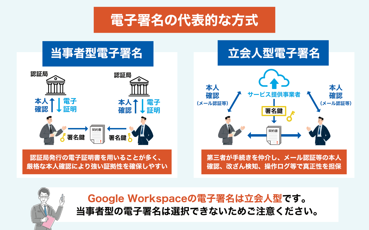 Google Workspaceの電子署名は「立会人型」という方式を採用しており、これは法的証拠力の面で一定の制限があります。立会人型では、Google(第三者)が署名を証明する形となるため、当事者が直接電子証明書を用いる「当事者型」と比較すると、裁判での証拠能力が劣ります。
