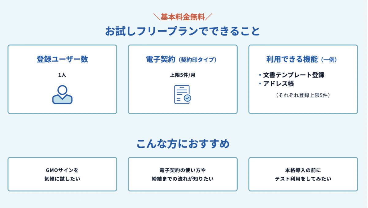 また、GMOサインなら無料プランから始められ、月5件までの契約締結が可能です。電子署名やタイムスタンプ、契約書の保管・管理機能など、基本的な電子契約に必要な機能をすべて無料で利用できます。