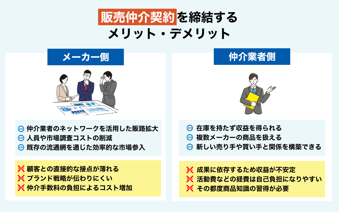 販売仲介契約には、メーカーと仲介業者の双方にメリット・デメリットがあります。契約前に特徴を理解し、自社の戦略に適しているかどうかを見極めなければいけません。