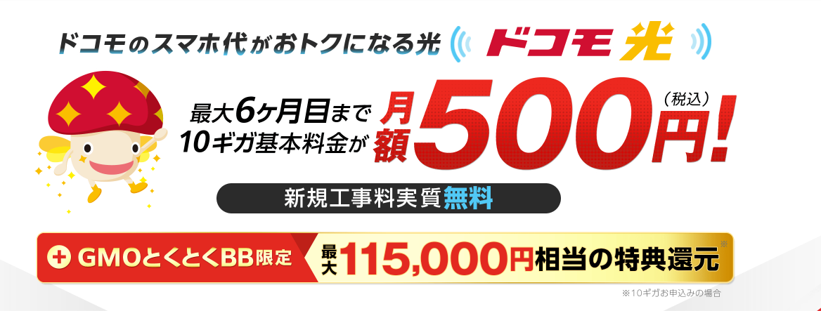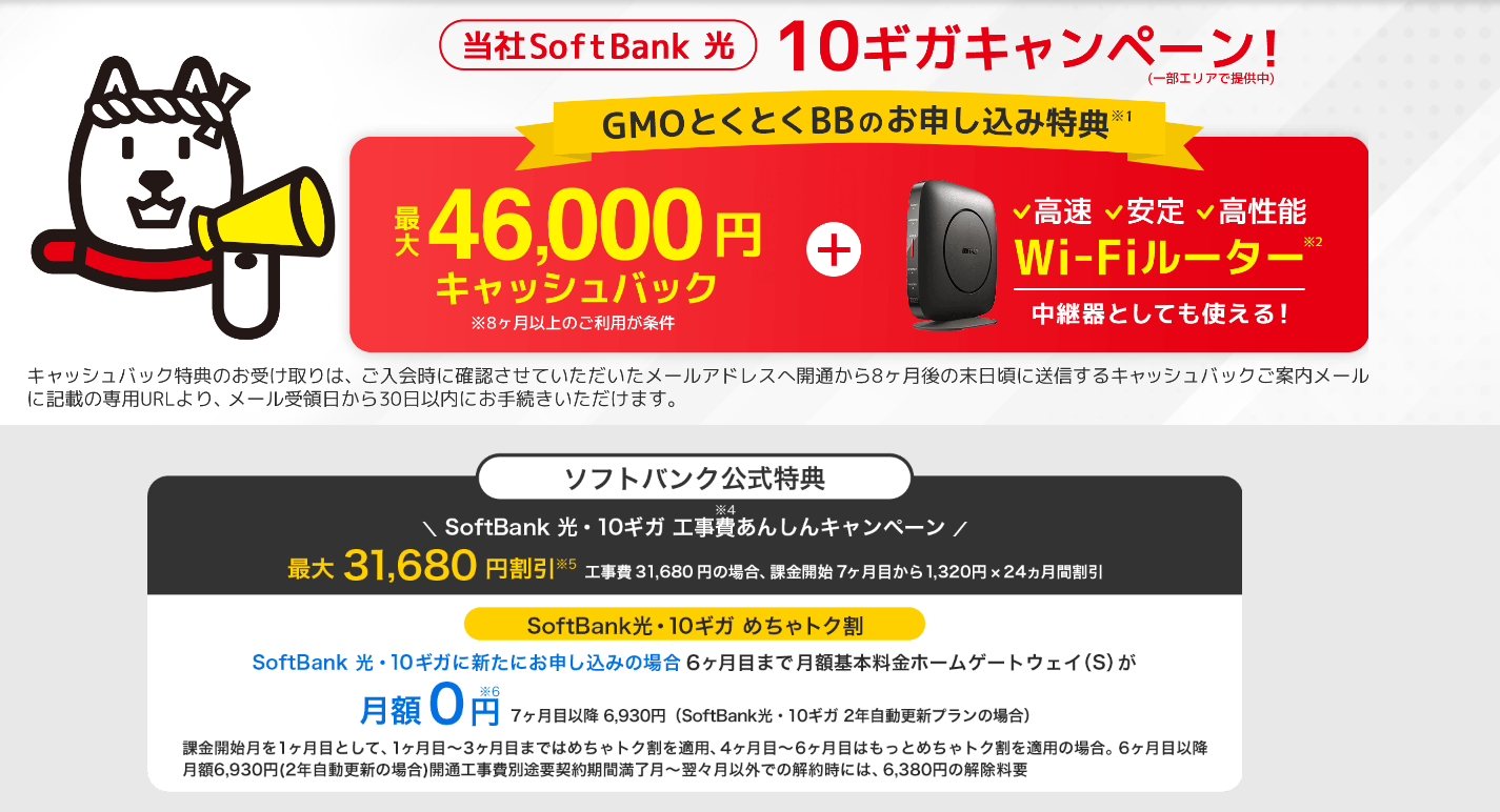GMOとくとくBBなら無料ルーターや工事費最大22,000円を無料、最大6カ月目まで基本料金500円(税込)になるなどの特典もあります。