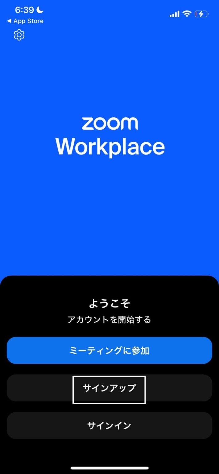 すでにスマホにダウンロードしているZoomアプリを開き、「サインアップ」をタップします。