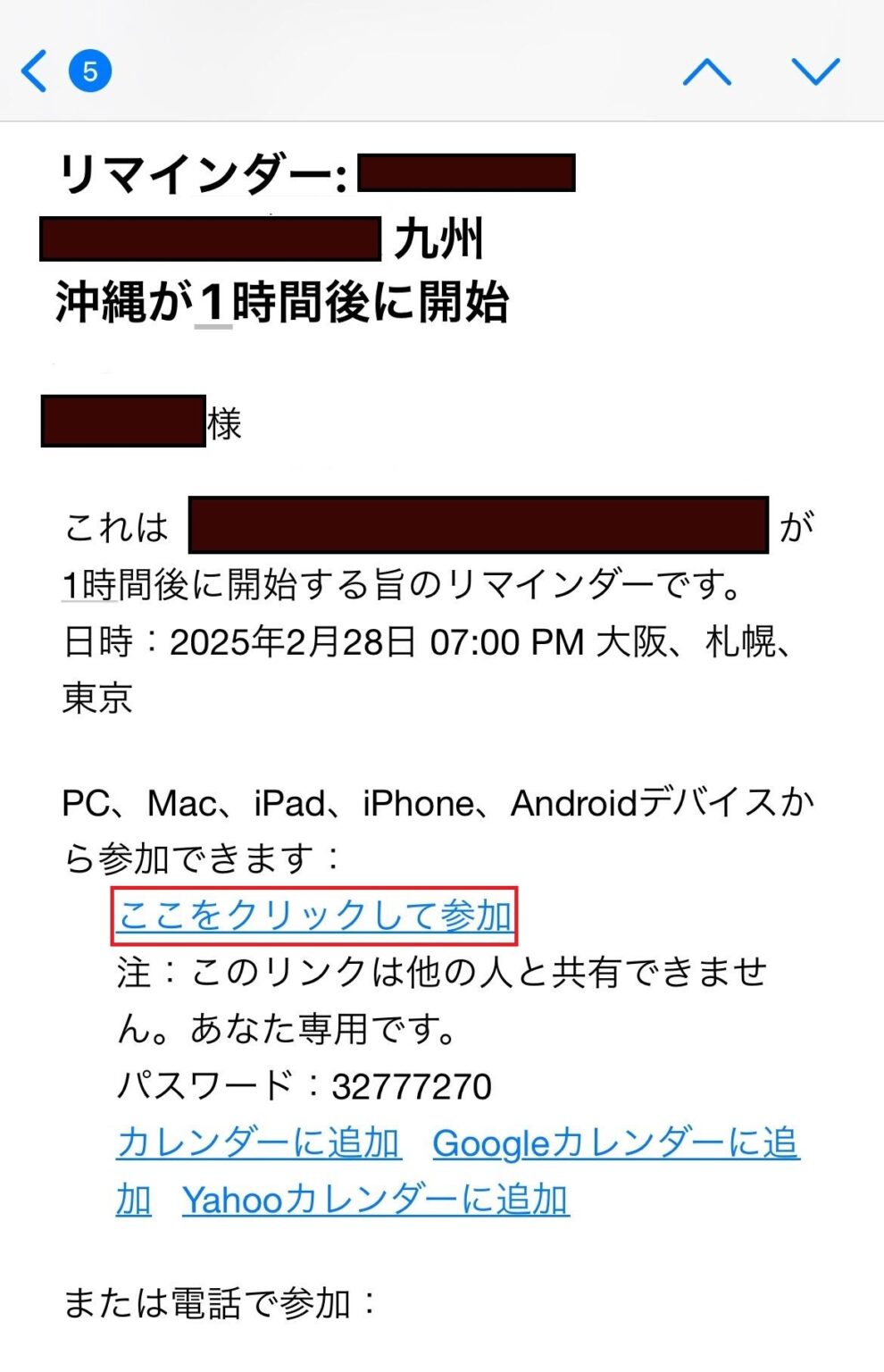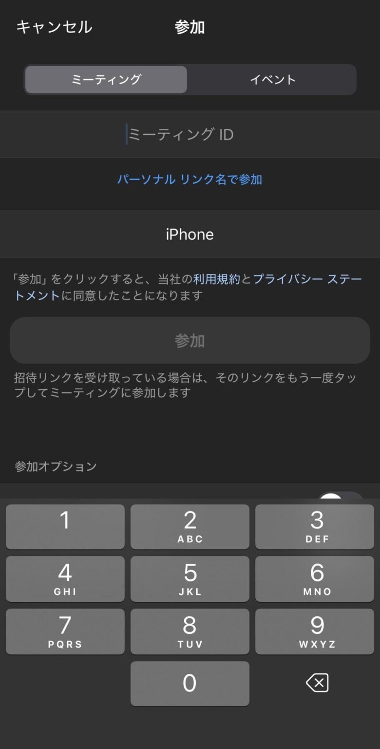 メール、メッセージアプリで送られてきた招待リンクをタップします。リンクが見当たらない場合は、迷惑メールフォルダも確認しましょう。または、ミーティングIDとパスワードを入力できます。