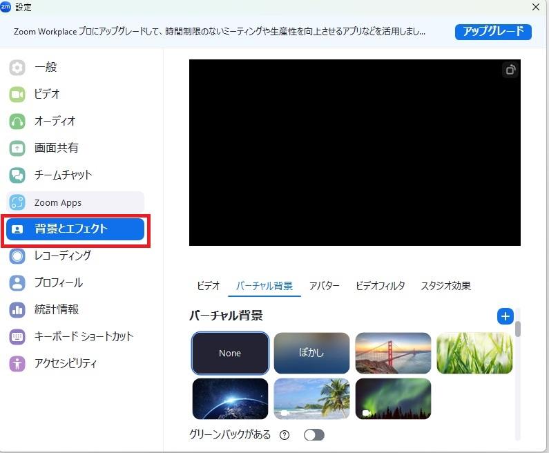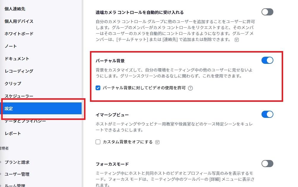 Zoomでは、背景を任意の画像や動画に設定できるバーチャル背景機能があります。まず、Webサイト設定で、バーチャル背景の設定になっているのかを下記の順番で確認してください。