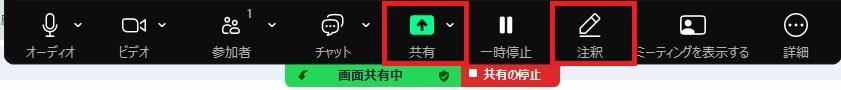 画面共有中は注釈ツールを使って、画面に直接書き込むことも可能です。重要なポイントを強調したり、参加者からの質問に回答したりする際に活用できます。注釈ツールバーは共有設定後に表示されるので、確認してみてください。